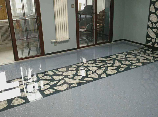 環氧彩砂裝飾地坪是以彩色石英砂和組成的無縫一體化的新型復合裝飾地坪。通過一種或多種不同顏色的彩色石英砂自由搭配,形成豐富多彩的裝飾色彩及圖案,具有裝飾質感優雅,耐磨損、耐抗壓、耐化